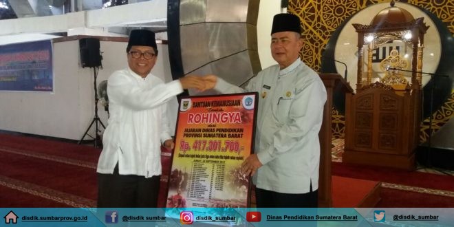Wakil Gubernur Sumbar Nasrul Abit, secara simbolis menerima Bantuan dana dari Dinas Pendidikan Sumbar yang berasal dari Guru-guru dan sekolah2 SMA/SMK se Sumatera Barat. Dana tersebut nantinya akan diteruskan ke etnis Rohingya yang sedang dalam penderitaan ditempat pengungsian.