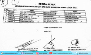 Gebyar Pendidikan Dinas Pendidikan Provinsi Sumatera Barat 2018 telah selesai digelar. Hari terakhir perhelatan Gebyar Pendidikan 2018, Jum’at(28/9) di halaman Kantor Dinas Pendidikan Provinsi Sumatera Barat, yang mengusung tema “Generasi Milenial, Berinovasi, Berkarya dan Berkreasi”. Perhelatan ini diikuti oleh siswa/i SMA/SMK/SLB se Sumatera Barat ikut ambil bagian dalam acara yang berlangsung selama tiga hari mulai dari 26 s/d 28 September 2018 ini .