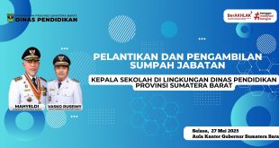 Dinas Pendidikan Provinsi Sumatera Barat menggelar pelantikan dan pengambilan sumpah jabatan bagi para Kepala Sekolah yang baru, berdasarkan Keputusan Gubernur Sumatera Barat Nomor 821.19.26/III-D/2025. Gubernur Sumatera Barat (Sumbar), Mahyeldi Ansharullah melantik 88 Kepala SMA/SMK/SLB di Aula Kantor Gubernur Sumbar, pada Selasa 27 Mei 2025 Ia menekankan, penunjukan kepala sekolah (kepsek) …