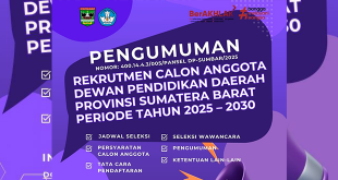 #Pengumuman Rekrutmen Calon Anggota Dewan Pendidikan Daerah Provinsi Sumatera Barat Periode Tahun 2025 – 2030 Bersama ini diumumkan bahwa Pemerintah Daerah Provinsi Sumatera Barat melakukan Rekrutmen Calon Anggota Dewan Pendidikan Daerah Provinsi Sumatera Barat Periode 2025-2030 dengan ketentuan sebagai berikut : 1. Penerimaan calon anggota akan dilakukan oleh Panitia yang …