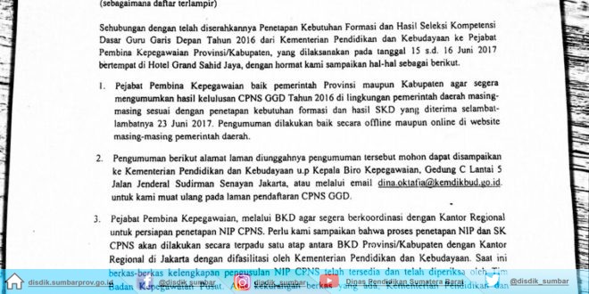 Sehubung dengan telah diserahkan kebutuhan formasi dan hasil seleksi kompetensi dasar guru garis depan tahun 2016, maka menetapkan keputusan kebutuhan pegawai ASN dari Program Guru Garis Depan Kemendikbud 2017 sebagai berikut