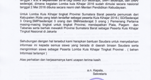 Dinas Pendidikan dan Kebudayaan Provinsi Sumatera Barat akan melaksanakan Lomba Kuis Kihajar ( kita harus belajar ) untuk tingkat Provinsi pada tanggal 7 s.d. 8 September 2016 bagi siswa SD/ sederajat, SMP/ sederajat, dan SMA/ sederajat, dimana kegiatan Lomba kuis Kihajar 2016 sudah dimulai secara nasional tanggal 2 Mei 2016 …